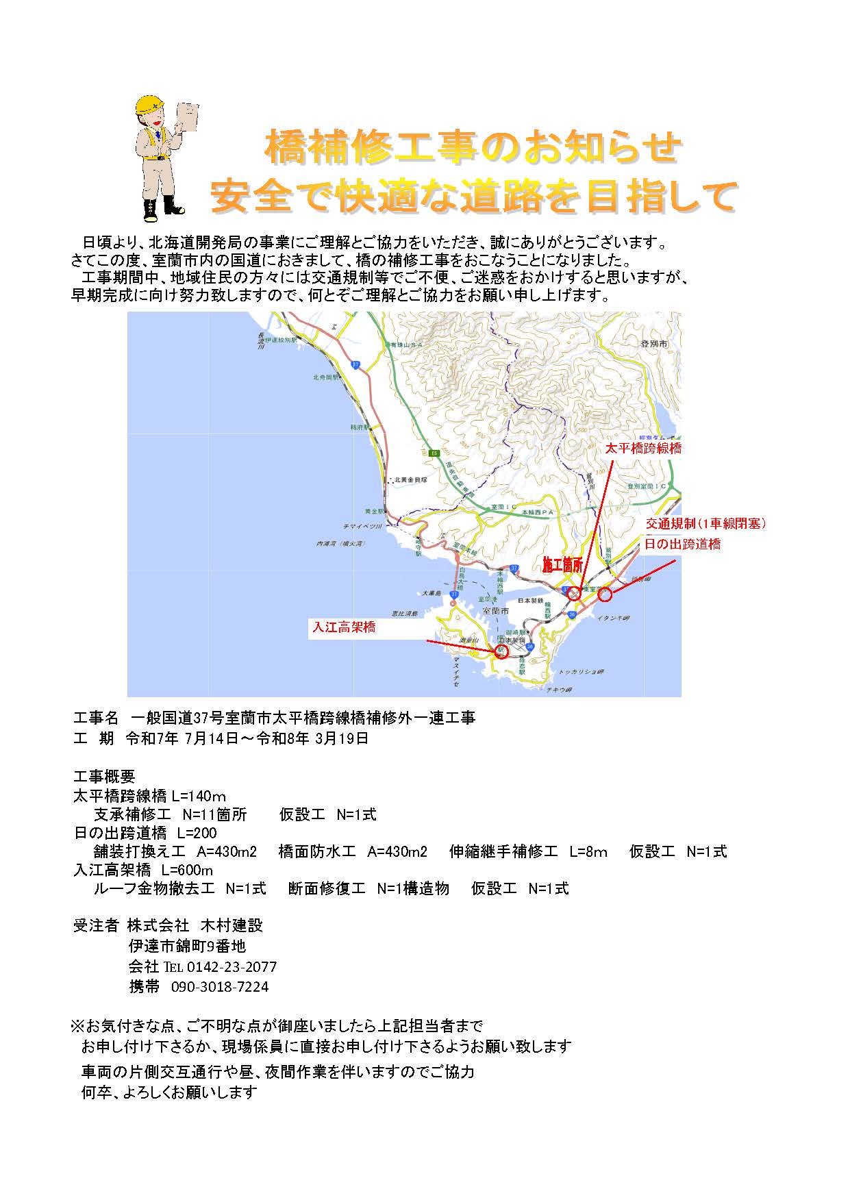 橋の舗装補修工事のため片側車線規制通行により昼間作業を予定しています
